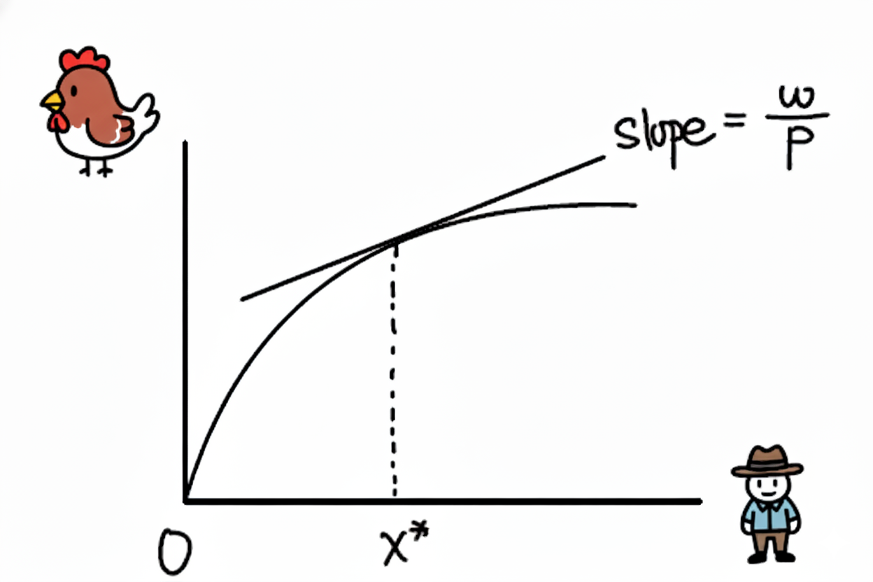 奶奶,您觉得刚才的数学公式是不是有点抽象?其实,我们可以用一个简单的图表来表达这个最优的选择情况。假设咱们的养鸡场,主要变量是饲养员的数量。想象一下,我们画一个图:横轴(x轴)是饲养员的数量,纵轴(y轴)是鸡的产量。这个曲线就是咱们的生产函数,显示了不同数量的饲养员能养出多少鸡。