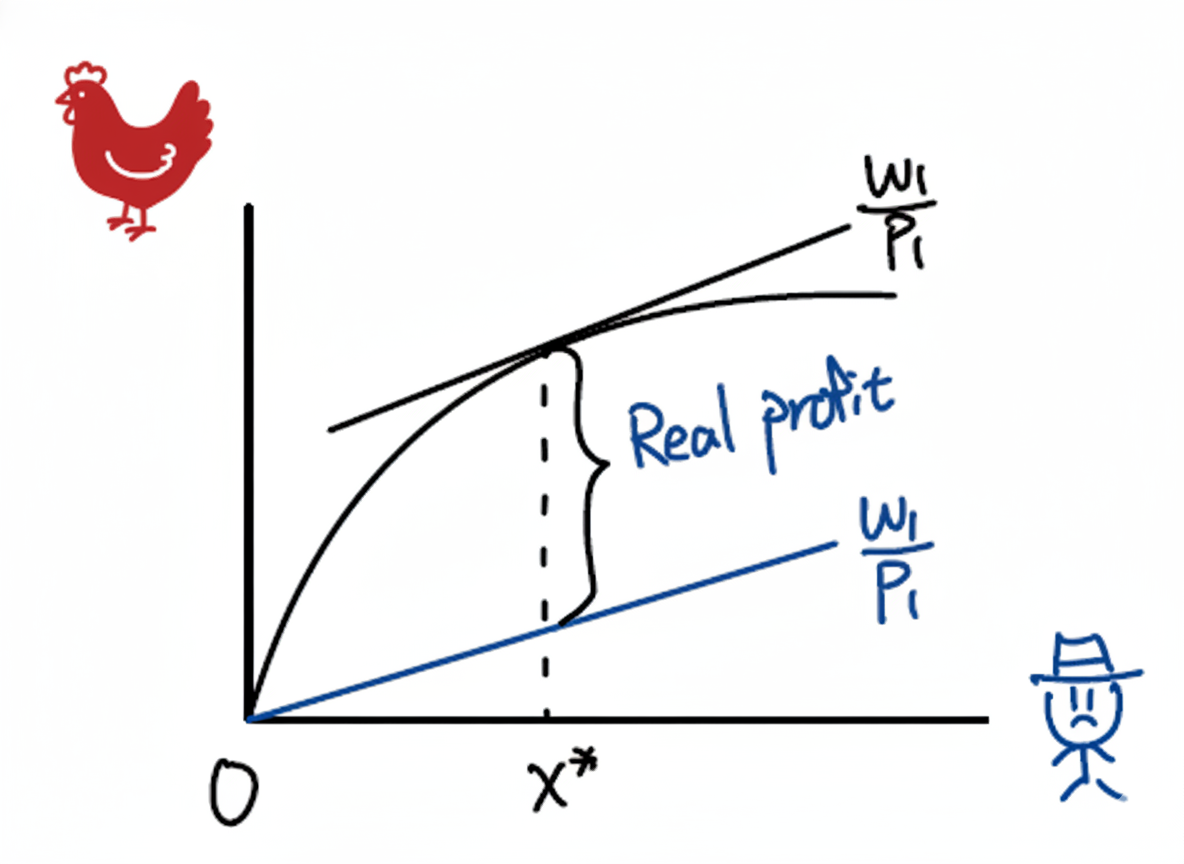 比如,一只鸡20元,小时工工资30元/小时。我们发现,多请一个小时工,他能额外多养2只鸡(\(MP_1=2\))。那么他创造的边际产品价值就是 \(20 \times 2 = 40\) 元。因为40元比30元工资高,所以请他来是划算的,能增加总利润!我们就会继续请人。但是您知道,鸡舍人一多就乱,效率会下降(边际产品递减)。当我们请到某个人时,他一小时只能额外多养1.5只鸡,那他创造的价值就是 \(20 \times 1.5 = 30\) 元,正好等于他的工资。好了,就到此为止,再多请人就不划算了。这时候,咱们的利润就最大了。