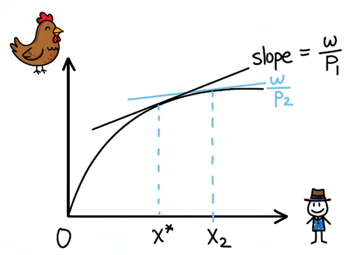 然后,我们再画一条直线,它的斜率是 \(w_1 / p\)(饲养员的工资除以鸡的价格)。这条线代表成本和收入的平衡。要找到最优的饲养员数量,就让这条直线变成切线,正好切于生产函数曲线上。切点的位置,就是那个黄金法则满足的点——边际产品价值正好等于工资的最优饲养员数量 \(x_1^*\)。